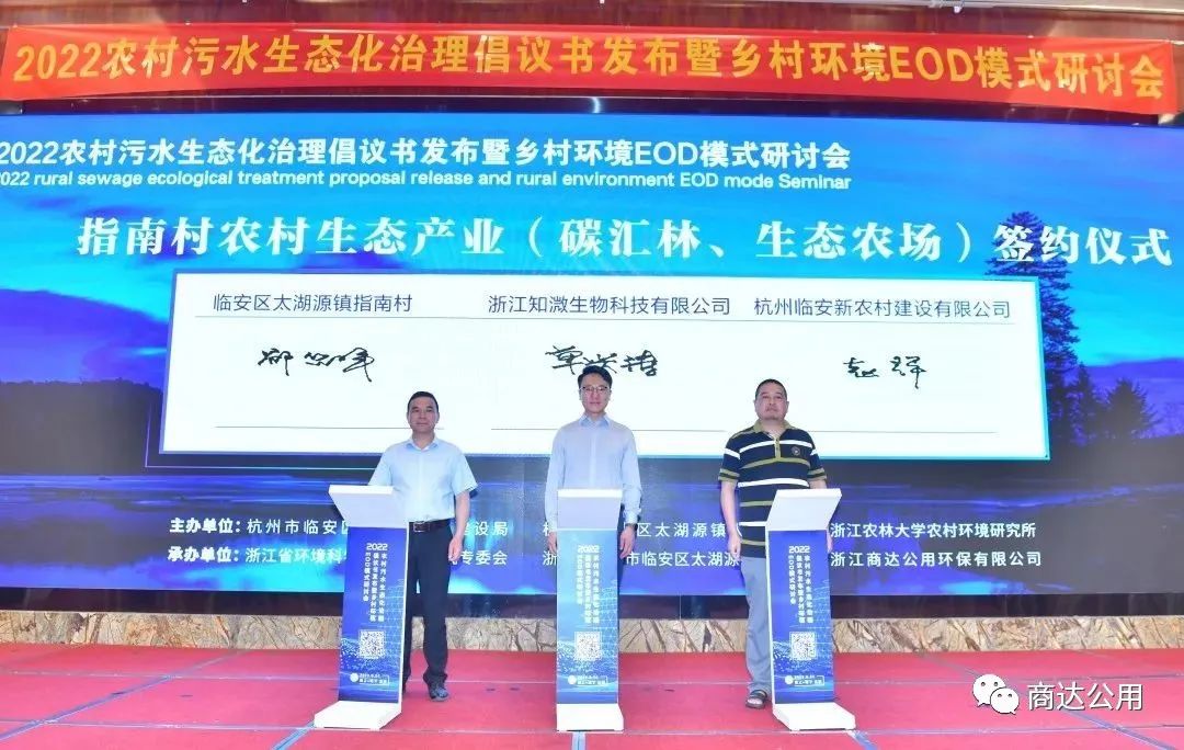 發布會上,舉行了臨安指南村農村污水免費運維簽約儀式,通過將農村污水治理與星級生態農場建設相融合,建立"水循環、碳循環、產業循環”的5.0生態循環模式,變廢為寶,一方面彌補農村污水運營的費用,另外一方面也激活了鄉村生態產業,探索綠水青山就是金山銀山生態路徑。
